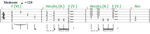 Végül a harmadik sorban (a videóban 25:28) egy újabb klasszikus akkordmenet látható: F-Hm7b5- E7-Am (VI-II-V-I).