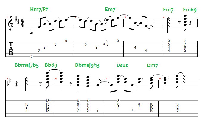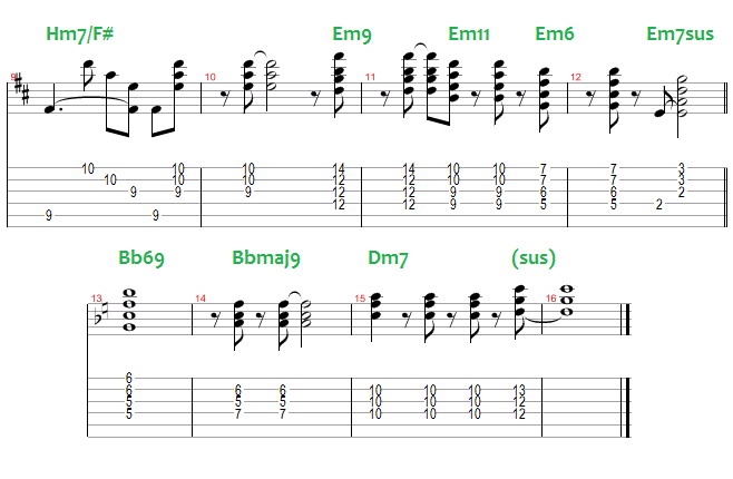 A kvartakkordokban a felrakás nem terces építkezésű, hanem kvartos (pl. egy Em7 esetén e-g-h-d-fisz-a-cisz helyett e-a-d-g-h). Ebben az akkordszólóban végig ilyeneket használtam. Gitáron könnyen foghatók, jól szólnak. Színezőhangokból bármi jöhet (külön jelöltem az akkordok felett), a lényeg a kvartos struktúra, ill. a kirajzolódó dallamok (lásd pl 11-12. ütem e-moll dallama).