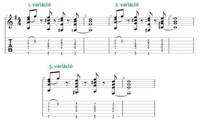 A harmadik ismétlésben a második és negyedik akkordban van változás. Ezek ismét fordítások: sus-jellegű akkordok. Visszavezethetjük őket akár dúrra, akár mollra. A második akkord lehetne akár C#m - vagy a dúrja is: E(7). A negyedik Hm vagy D. Hangjaik megegyeznek.