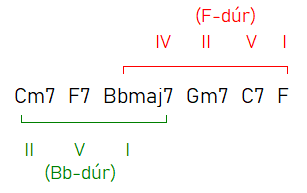 Vegyük a fenti akkordkört (Cm7-F7-Bbmaj7). Gondolhatunk úgy az egyes akkordokra, hogy azok többféle funkcióval is bírhatnak. Major7 akkord hol is fordulhat elő egy hangnemben? I. és IV. fokon. A Bbmaj7 akkordot vehetjük tehát kettős funkciójú akkordnak: az I. fok (tonika) mellett lehetne akár IV. fok is (szubdomináns) - azaz egy F-dúr hangnem IV. foka.