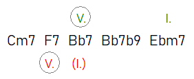 Az I. fokra való feloldás helyett a Bb akkordot az új hangnem jegyében egyből domináns (V.) fokként gondoljuk el.