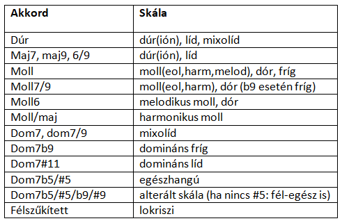 Akkordkör esetén még konkrétabb a helyzet, mert az akkordokhoz egyből kapcsolódnak a hozzájuk illő skálák.