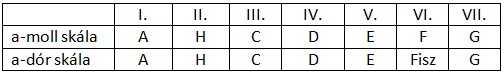 • h, c, d, e, fisz, g, a = fríg (a dúrhoz képest a III. fokról indul)