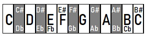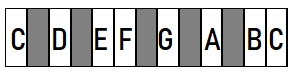 A hangok közti távolságok (egész-egész-fél-egész-egész-egész-fél) kirajzolják a dúr-alaptörvényt: minden dúr hangsor ezt követi.
